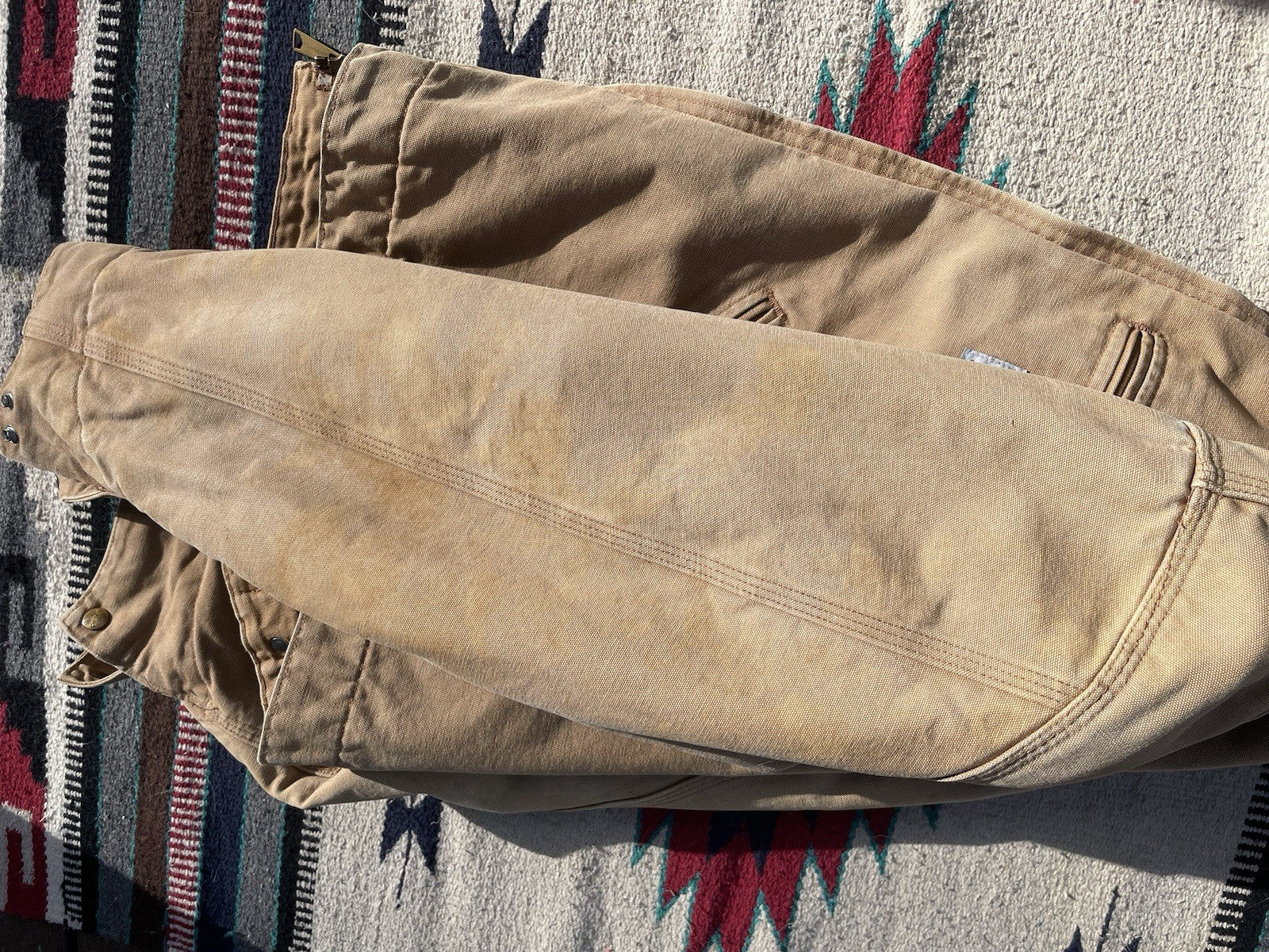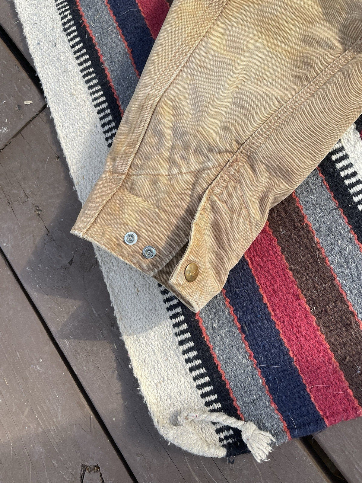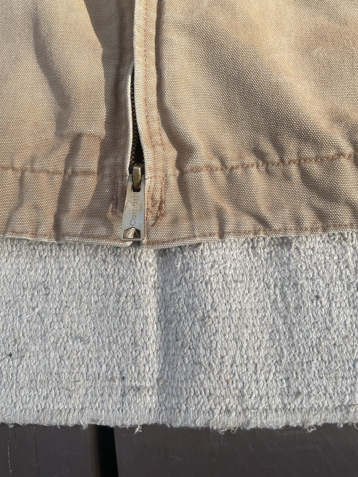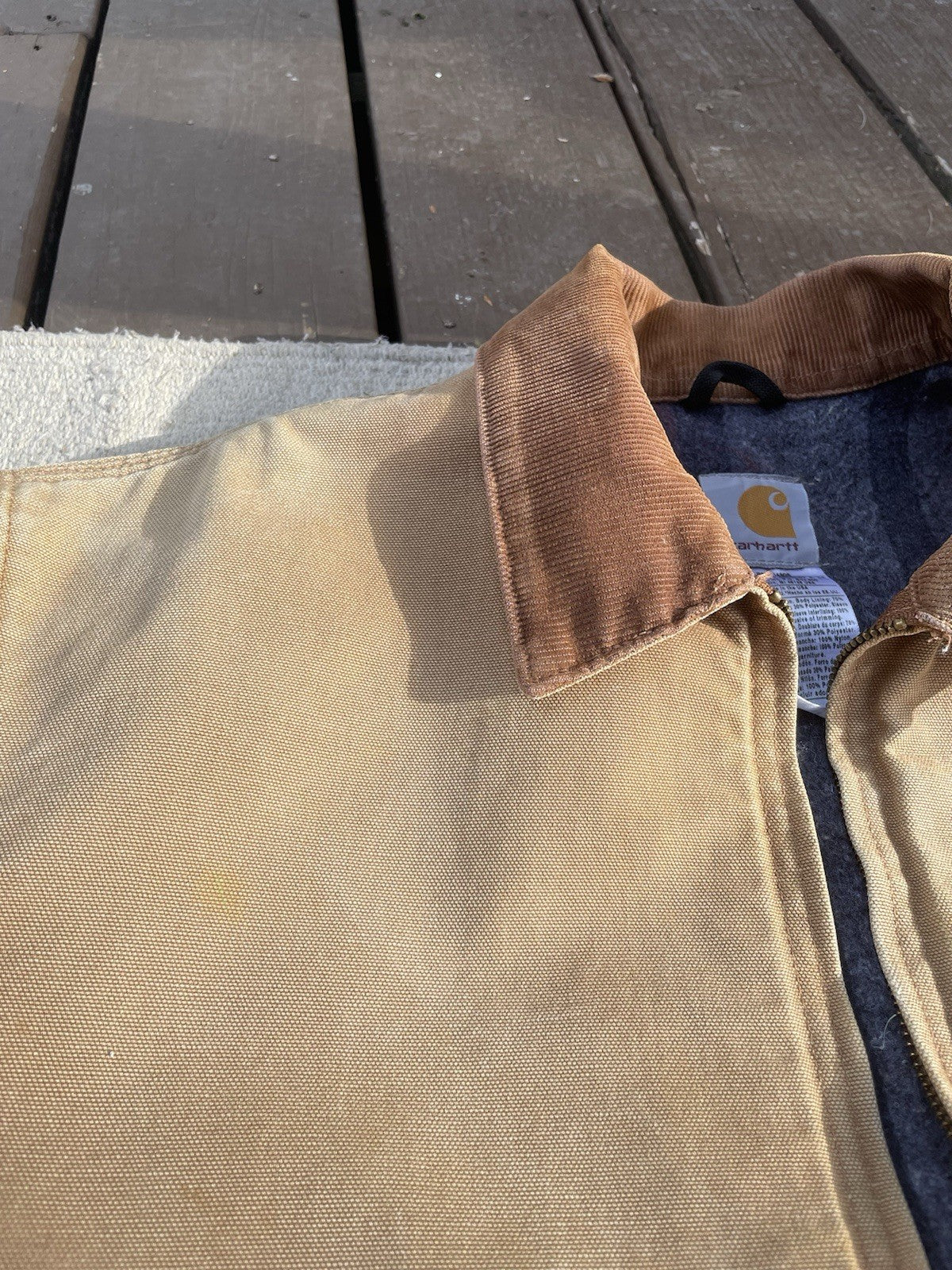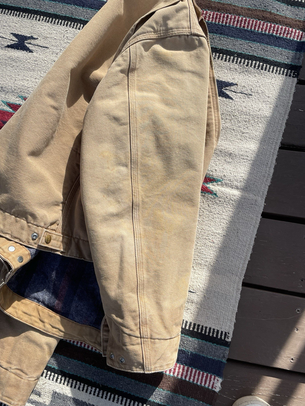 This is a vintage Carhartt J01 Detroit jacket made in 2004. There is some minor staining and color-fading under the forearms (reference pictures).