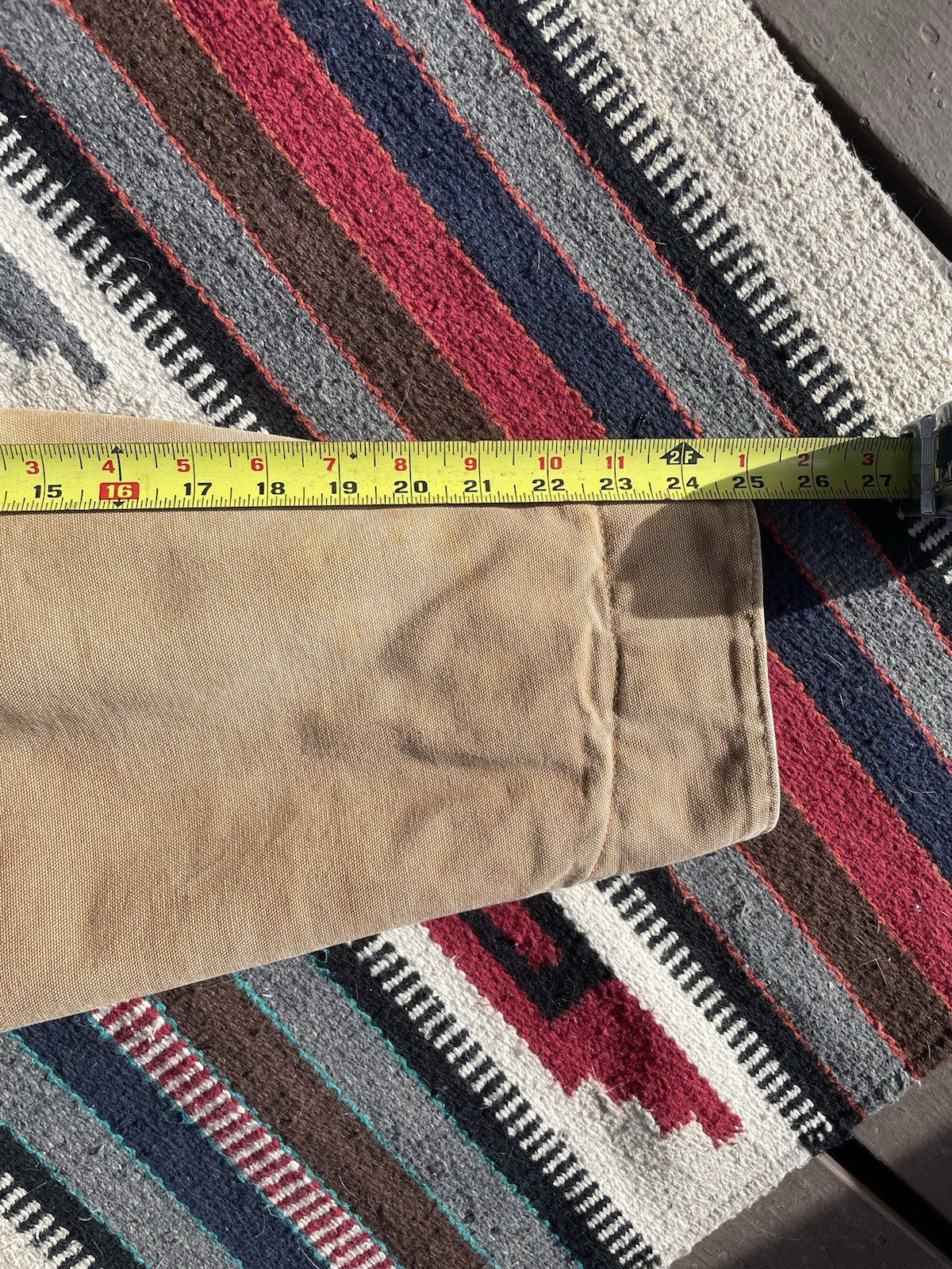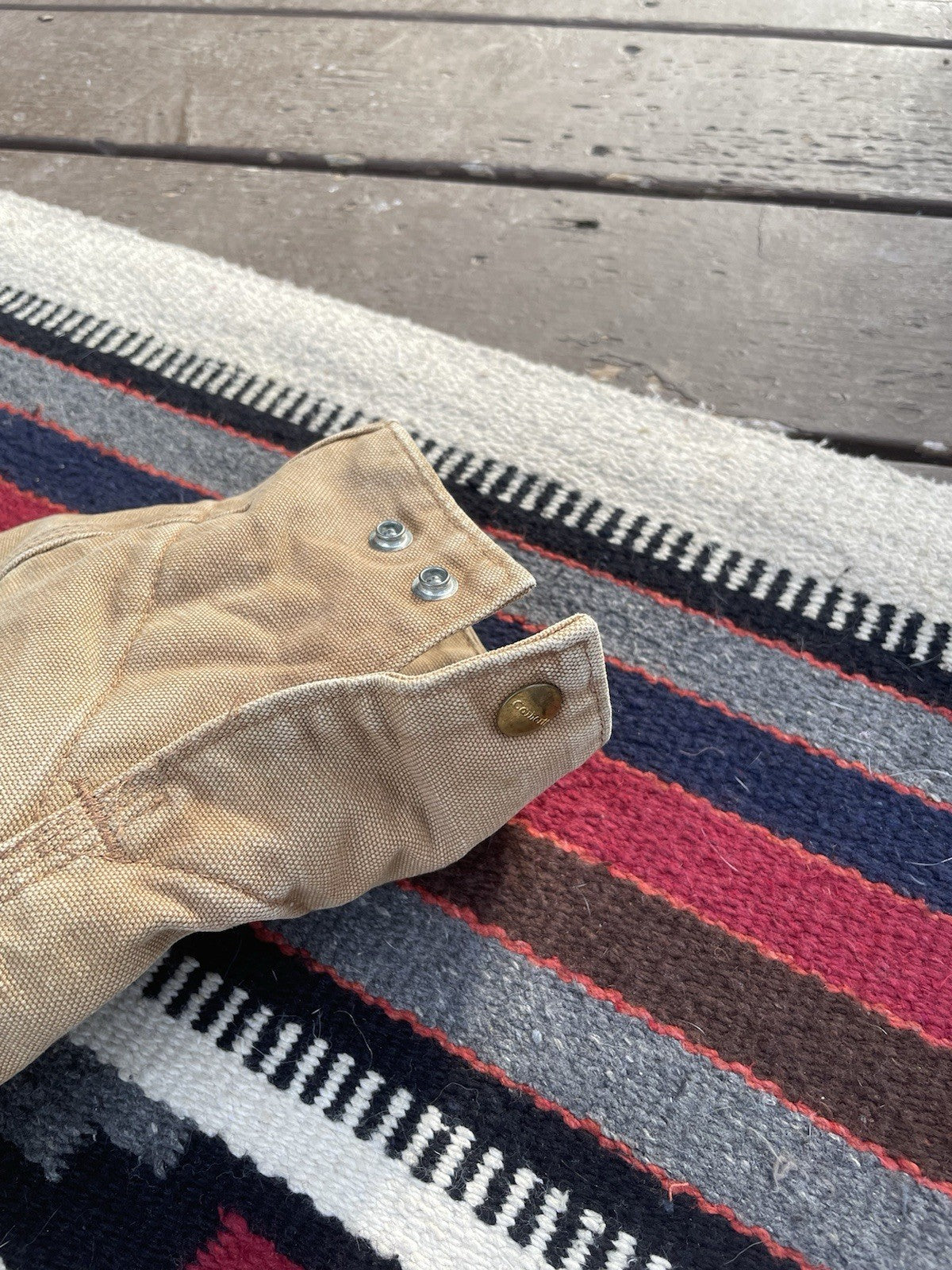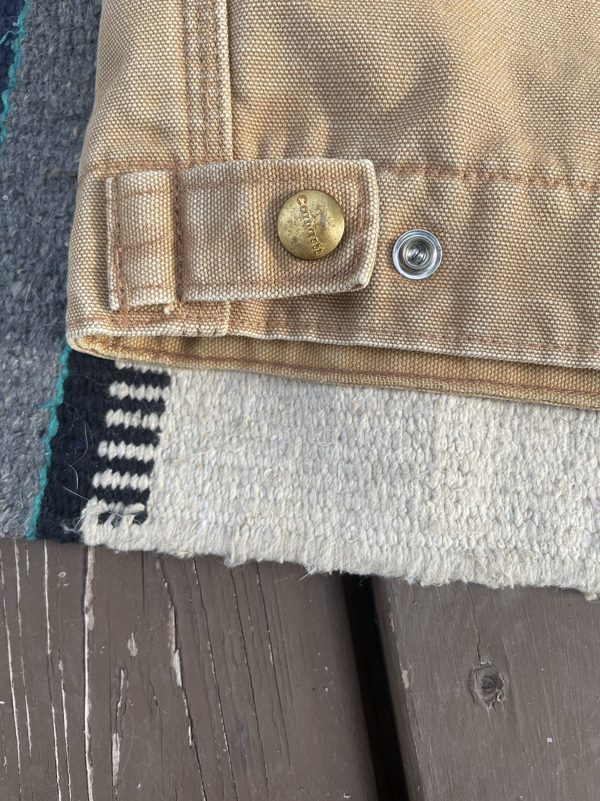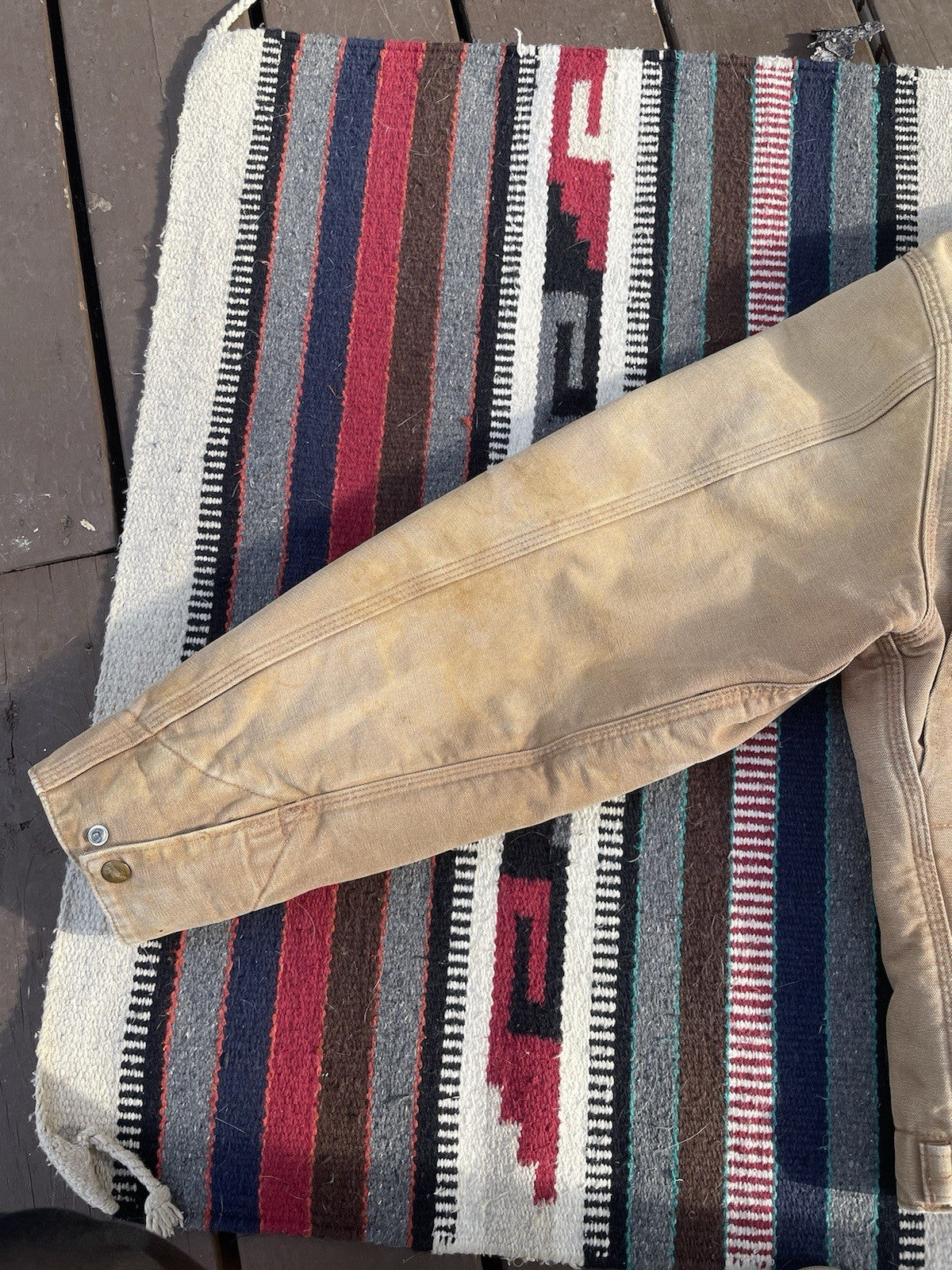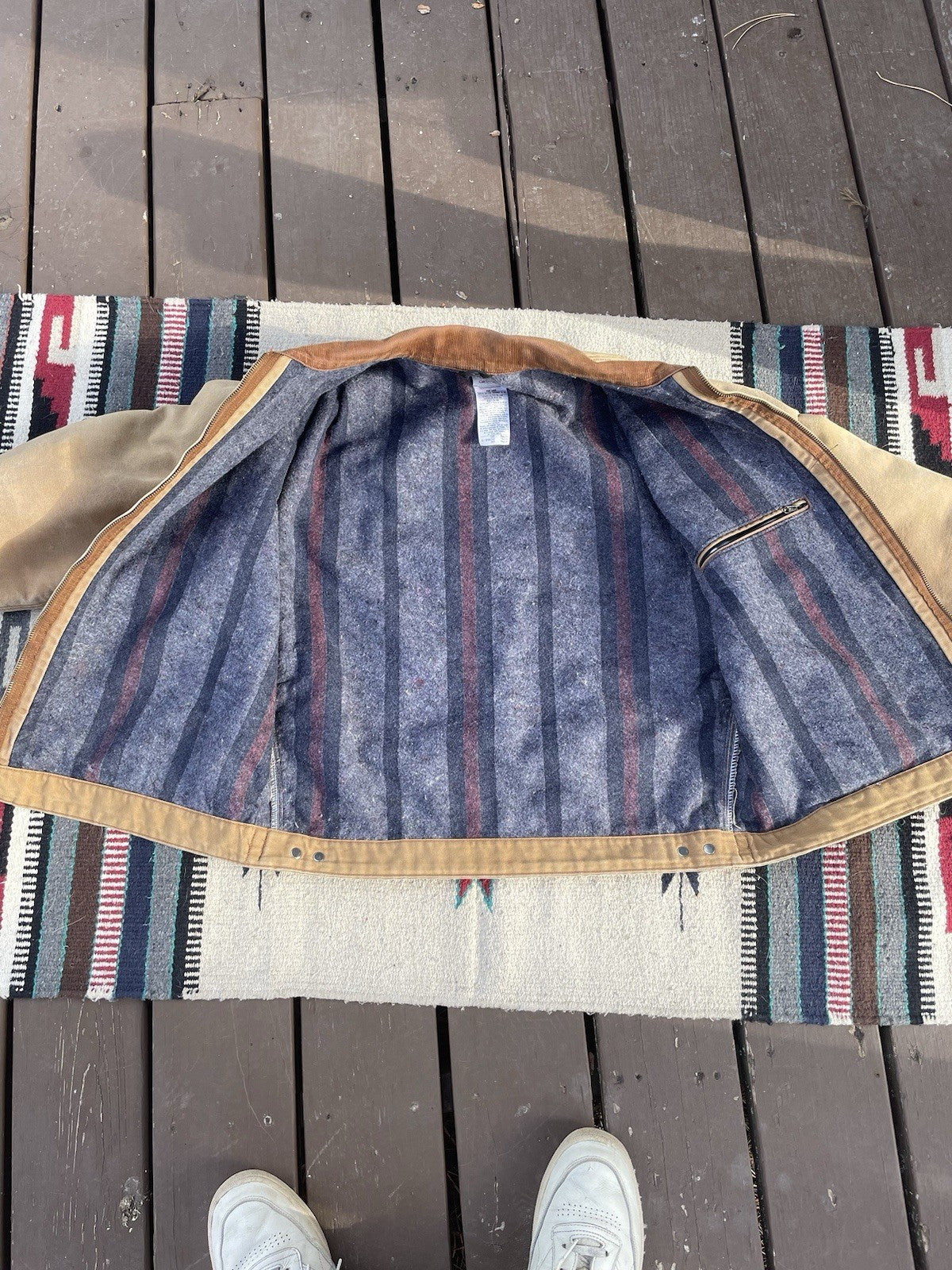 This is a vintage Carhartt J01 Detroit jacket made in 2004. There is some minor staining and color-fading under the forearms (reference pictures).